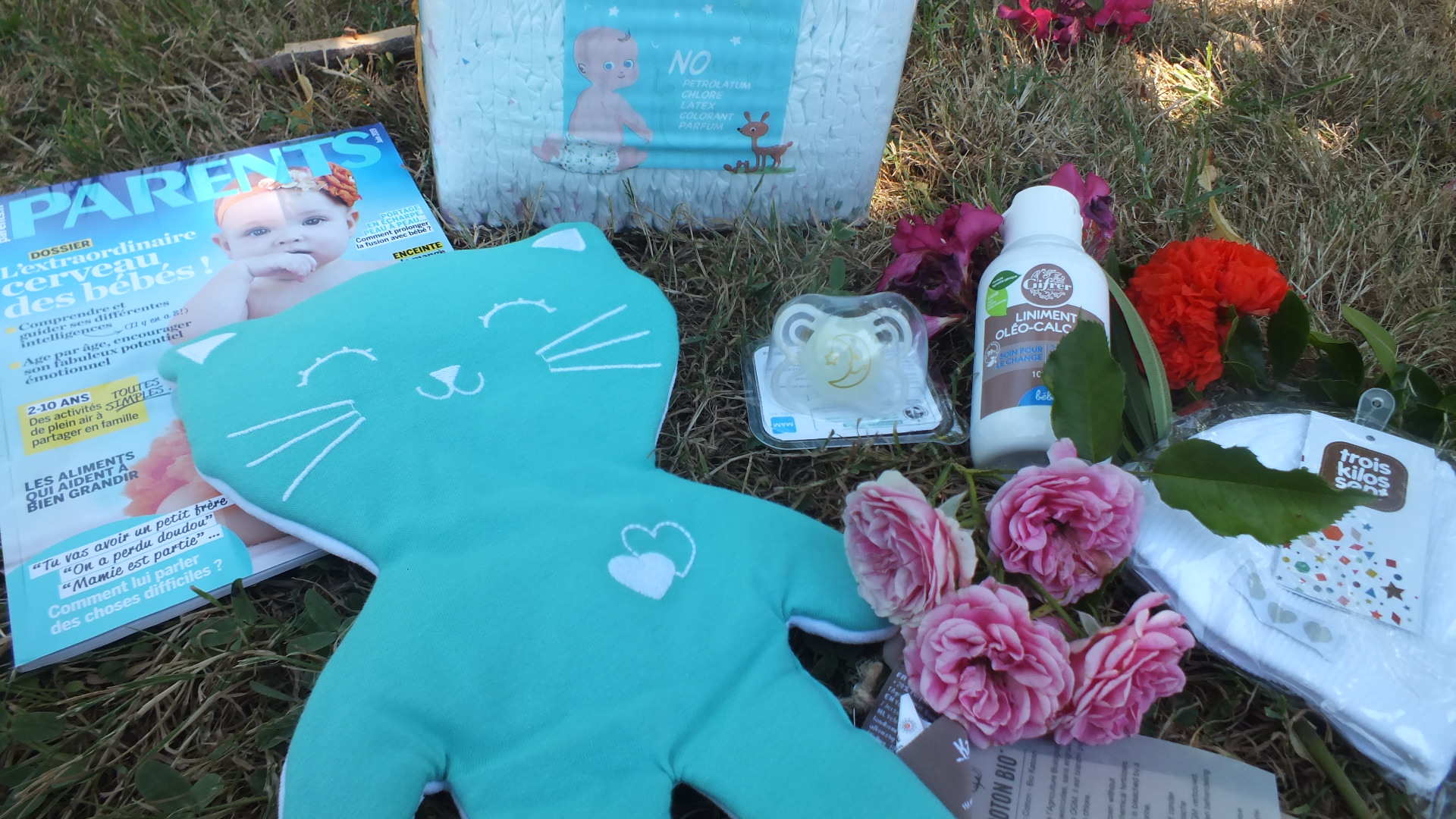 Alors plus précisément, j’ai reçu de mon côté la box du 9ème mois et voici en photo ce que j’ai eu à l’intérieur : un paquet de couches taille 1, une sucette taille 0, un doudou en coton bio, un petit bonnet en coton bio également, un flacon de liniment et le magazine Parents de ce mois-ci.