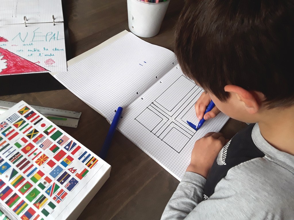 De plus, comme mon fils adore collectionner tout un tas de choses, il conserve ses créations dans un classeur qui lui permet de revenir dessus quand il le souhaite pour se remémorer les différents pays 🙂 Je ne corrige pas forcément l’orthographe, je ne lui impose pas non plus de faire une œuvre d’art (sans dépasser etc), l’idée avant tout est d’imaginer, de prendre du plaisir, et d’apprendre en jouant.