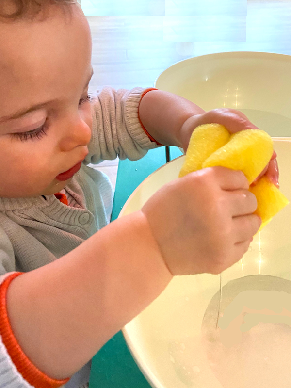 L’enfant trempe l’éponge dans un contenant afin d’absorber de l’eau avec l’éponge, et presse l’éponge gorgée d’eau dans le second récipient. L’idée étant de vider un récipient pour en remplir un autre. Cela paraît simple mais c’est assez complexe ! Ce type d’activité permet de développer un certain nombre de compétences comme par exemple la motricité fine en favorisant la préhension et la manipulation des objets. Mais ce jeu permet également d’affiner la coordination et la précision de ses mouvements, d’améliorer la concentration et la pensée logique (relation de cause à effet) et d’encourager l’autonomie et la prise de confiance en soi de l’enfant.